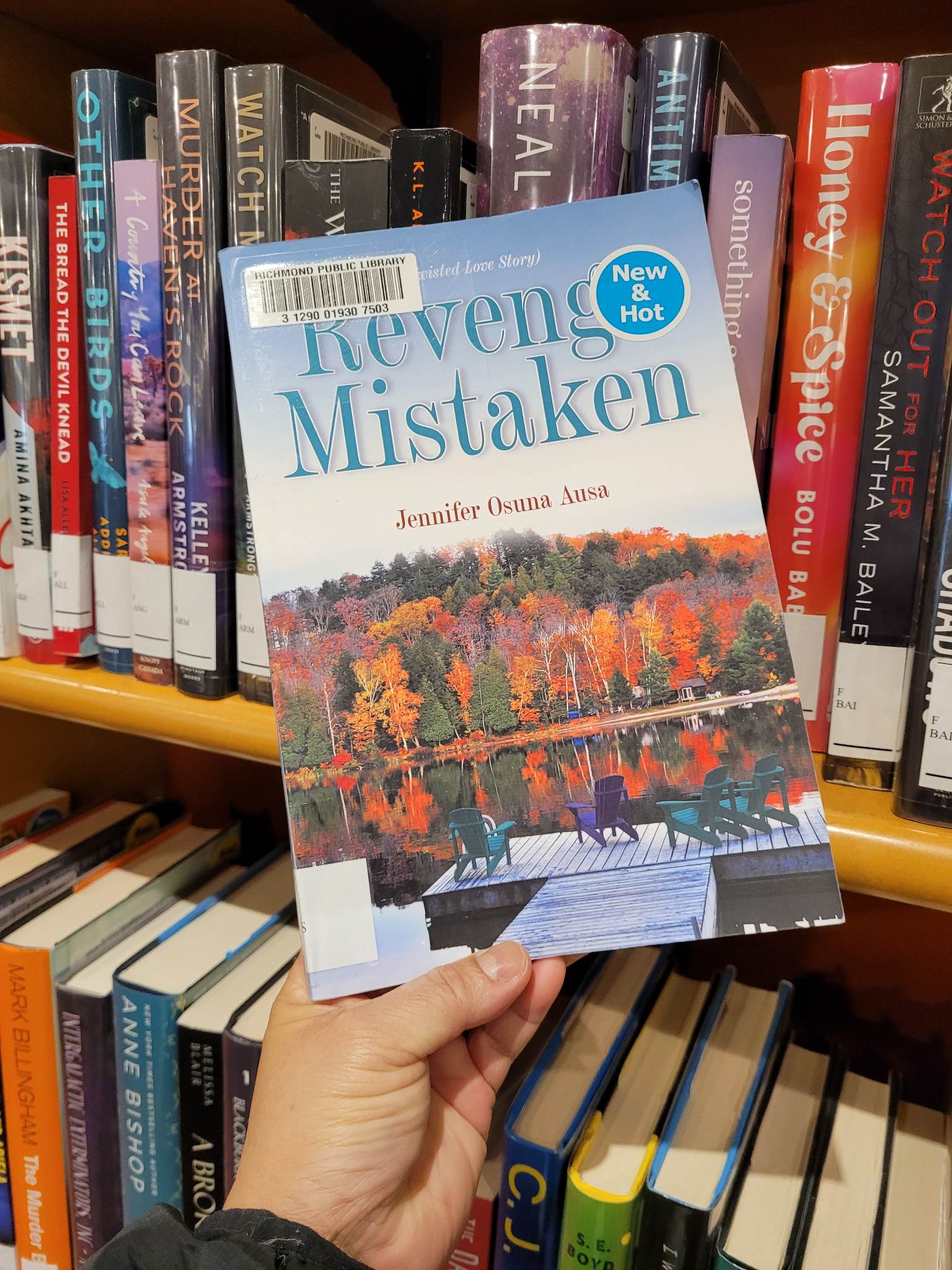 Yesterday was a gorgeous sunny day, so after my hair appointment, I headed to our local library to see if my book was there. I had never seen my work in a library before. I searched the shelves in the adult fiction section after searching for my book on the computer, but I was unable to locate it there. I approached a library assistant and asked where I could find Revenge Mistaken. I told her who I was. She then advised me to check the New and Hot Bestsellers section if it isn’t in the adult fiction part. According to her, the other copy was just returned last night and is possibly still in the sorting room. Then I went to the New and Hot Bestsellers section, and lo and behold, it was there. I couldn’t explain how I felt about seeing my book among other books. The first thing I noticed was how thin my book was. But I know my story is big. It was easy reading, maybe five to six hours reading time.